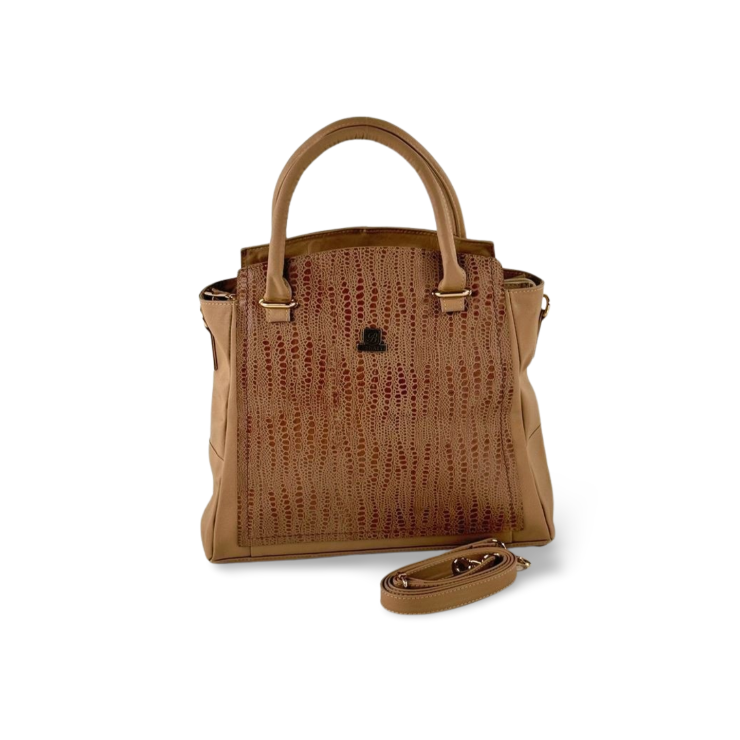Bolso tote elaborado en cuero de alta calidad, con un diseño texturizado que aporta elegancia y distinción. Su tono camel lo convierte en un accesorio versátil y atemporal, ideal para el día a día o para complementar looks más formales.